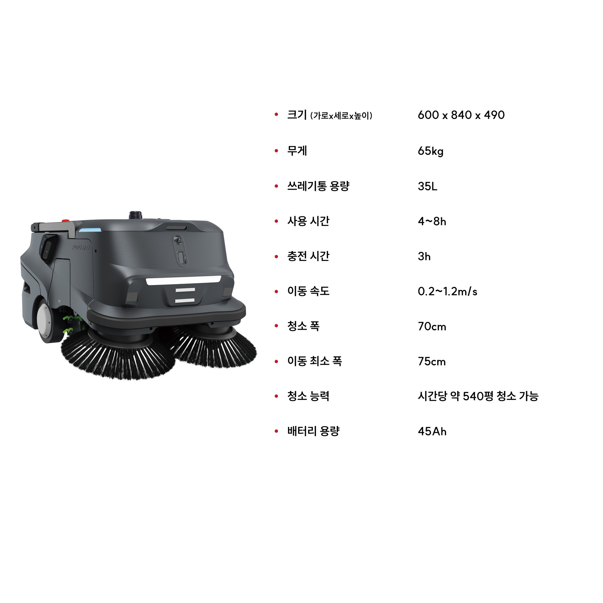 최대 8시간 연속 운행이 가능하며 긴 배터리 수명과 3시간 급속 충전이 가능합니다. 충전 도킹 시스템을 통해 최대 24시간 운영을 지원합니다.